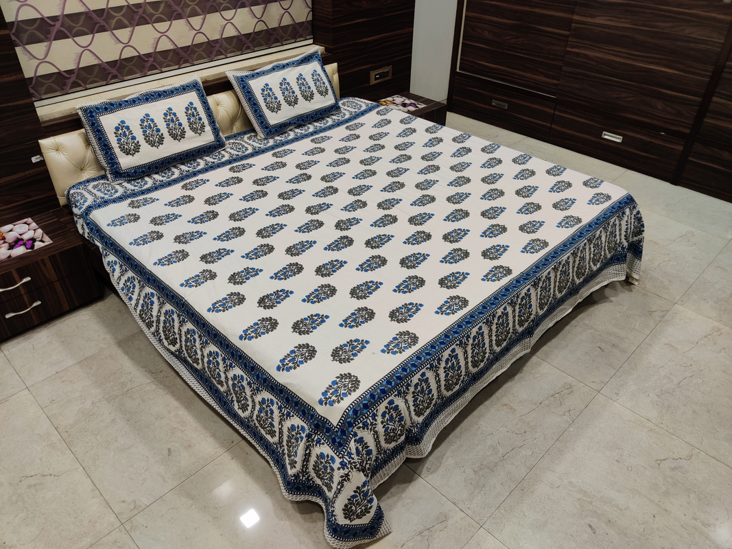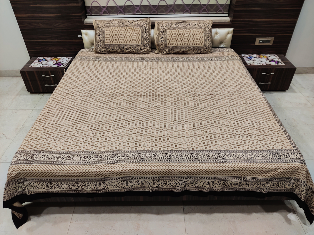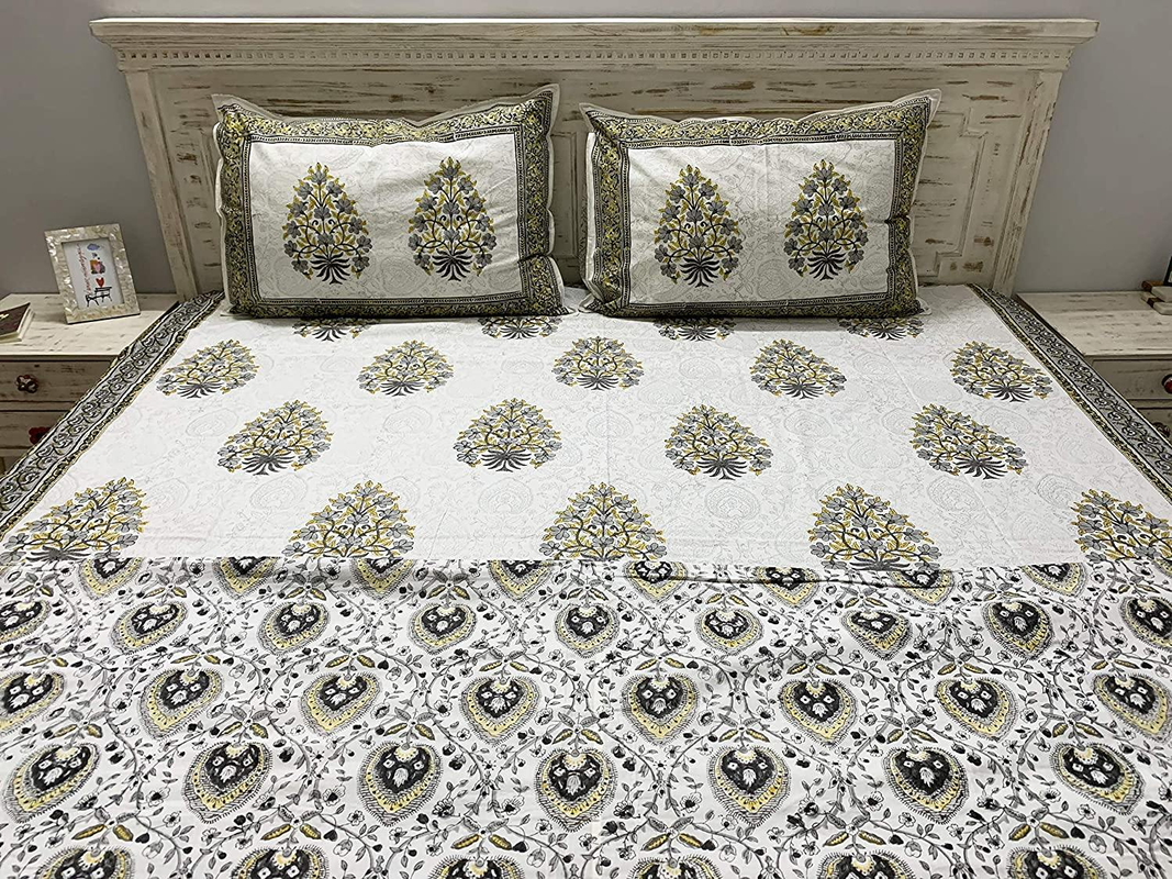 Heer Premium Cotton Block Print King Size Bedsheet + 2 Pillow Covers